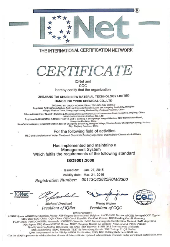 In March 2013, the company passed the ISO9001:2008 quality management system certification In July 2013, I obtained the NSF certificate |